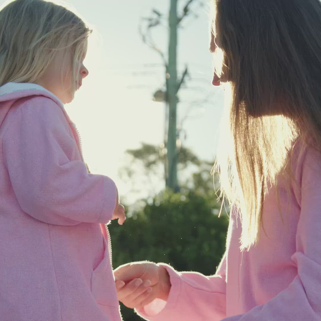 The MENORCA Kids TERRY hooded towel has pockets, zip through the front, TERRY inner weave, while the outside is a smooth Turkish cotton finish & is longer at the back to provide more material under the legs when sitting down. Simply zip up & go! A hooded towel that dries while you are wearing it, keeps you warm and won’t stay damp for long. A hoodie and towel in ONE!