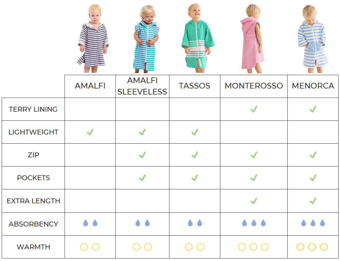 The MENORCA Baby TERRY hooded towel has pockets, zip through the front, TERRY inner weave, while the outside is a smooth Turkish cotton finish & is longer at the back to provide more material under the legs when sitting down. Simply zip up & go! A hooded towel that dries while you are wearing it, keeps you warm and won’t stay damp for long. A hoodie and towel in ONE!